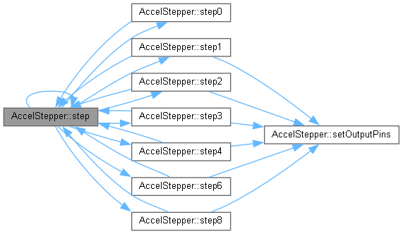 Called to execute a step. Only called when a new step is required. Subclasses may override to implement new stepping interfaces. The default calls step1(), step2(), step4() or step8() depending on the number of pins defined for the stepper.