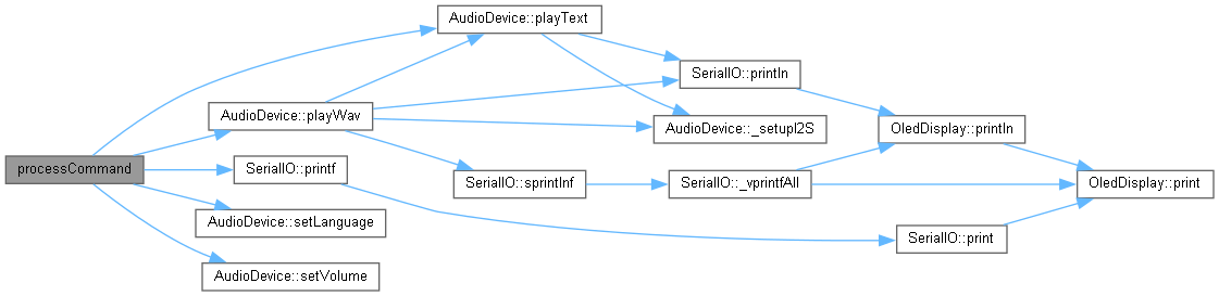 Based on the value of cmdType set by getCommand(), dispatches to the appropriate AudioDevice method: AudioDevice::playText() for text‑to‑speech or AudioDevice::playWav() for WAV playback. Unknown commands are reported via the serial interface.
