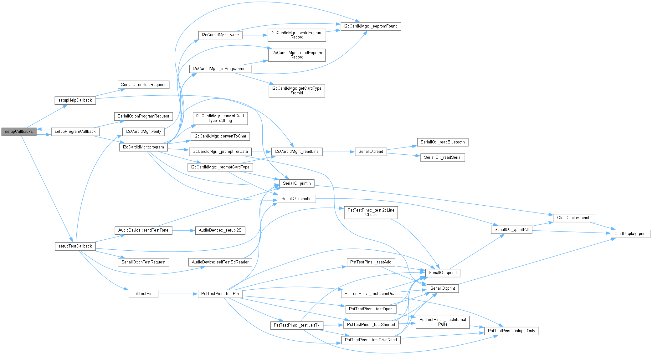 Calls setupHelpCallback(), setupTestCallback(), and setupProgramCallback() to register the help, test, and program handlers. Must be invoked after SerialIO has been initialized.